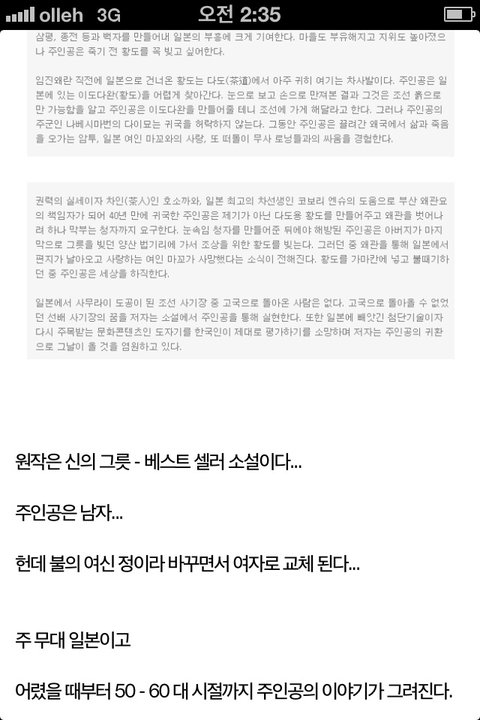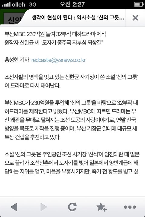 신한균 도예가가 소설 신의그릇을 출간했을때 우리나라 최초의 도자기 소설로 많은 주목을 받았었습니다 아무도 도자기라는 비대중적 예술에대해 그만큼 많이 알고 연구하고 소설까지 출간할 생각을 못했었으니까요 신한균 선생님이 쓴 또다른 도자기책 우리사발이야기는 도예가들에게 지침서가 될정도로 유명합니다 그정도로 도예의 역사에 대해 많이 연구했지요 좀더 대중적으로 알리기위해 10년의 자료조사와 2년의 집필로 이십킬로나 빠져가며 소설을 출간했습니다 그래서 kbs sbs mbc 너도나도 드라마 계약을 하러 찾아왔었죠 도자기에 관심많은 일본수출과 소재의 참신성때문에 .. 결국 엠비씨와 계약을 합니다 그러구 몇년을 기다렸는데 세트장문제로 제작사가 넘어가고 하는과정에서 여자주인공으로 바꾸자고 제안합니다 대장금처럼 가보자고 한거죠 이름도 불의여신정이라고 바꾸고 시청률이 나올려면 왕이나와야한다고 했답니다 그래서 원작자가 그건안된다 거절했죠 그러나 권순규라는 작가가 백파선이라는 인물을 차용해 소설을 썻다면서 그걸로 하겠다던군요 드라마화까지 오년을 기다렸는데 청천벽력이었을겁니다 본인에겐 .. 소재만 가져다쓴게 무슨문제냐구 반문할수도 있겠지만 불여정은 최초로 도자기얘기라고 언플을엄청 한만큼 소재가 매력적입니다 최초의 도자기 소설은 분명 신의그릇이었고 드라마도 그랬어야 합니다 불의여신정이원작 없었던것처럼 꾸밀려고 제목변경 기사와 신의그릇 관련 기사를 다 삭제시키고 권순규 작가가 원작소설을 출간하더군요 방송작가가 어떻게 백파선이란 인물을 알았을까요? 백파선은 신의그릇에 조금 나오는 인물입니다 대중들은 언론의힘이 보이는 그대로 믿겠죠 하지만 그과정에 억울하게 희생된 창작자가 있다는 사실을 알았으면 합니다
