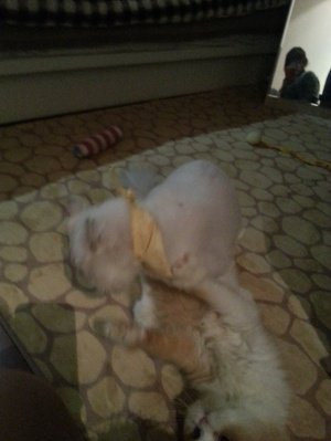 거기다 붕어는 겁도 없음. 야돌이는 6키로 지는 3키로인데, 귀차니즘이 극에 달한 야돌이에게 툭하면 장난을 걸음. 형님을 미용시켜 놓으면 먼지털이 같은 꼬리를 자기 장난감으로 알고 그렇게 톡톡 치고 물고 그러다 아래처럼 당하는 거임. 그런데 신기한건 야돌이임. 승질나면 수의사 선생님 손도 뚫어놓는 드러운 늠인데 동생이 그렇게 귀찮게 굴어도 솜방망이질만함. 앞서도 말했지만 탁묘를 잠시 받은 적이 있었음. 워낙 인간도 동물도 상대하기 싫어하는 놈인지라 탁묘온 고양이를 피해 현관 돌바닥에 가 있는데, 탁묘온 고양이가 친한척을 하러 갔던 거임. 귀찮다고 피해서 도망다니다가 그런 자신이 빡쳤는지 순간 침대에 올라가 그 큰 앞발로 탁묘 고양이의 머리를 퍼퍼퍼퍼펖ㄱ 소리나게 연타로 가격을 하는 거임. 그러더니 캬악 하고 하악질 작렬하는데... 이러다 탁묘온 고양이 사단 나겠다 싶었음. 출장 기간동안 봐드린다 했지만, 다치면 진짜 큰 일이니 그쪽 집사님 지인에게 돌려보낼 수 밖에.