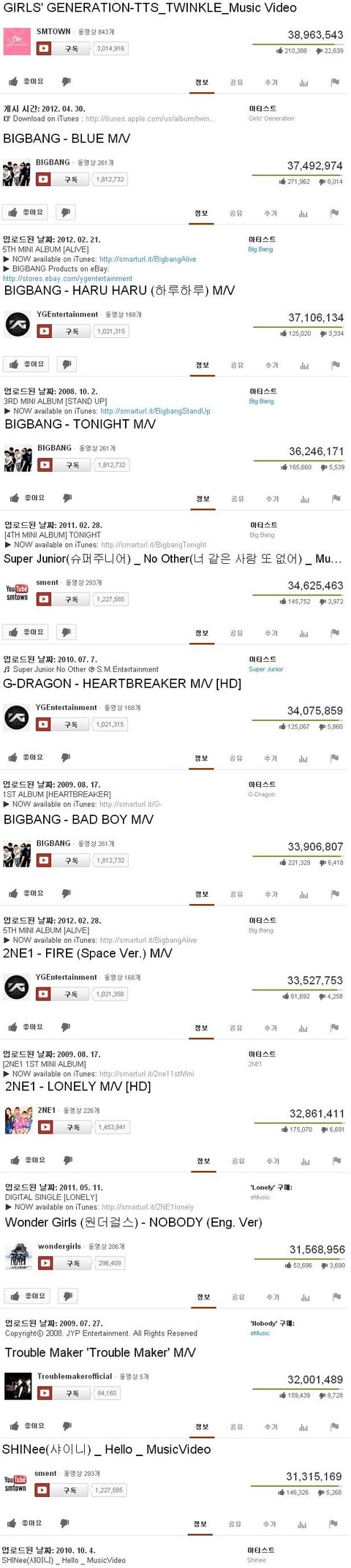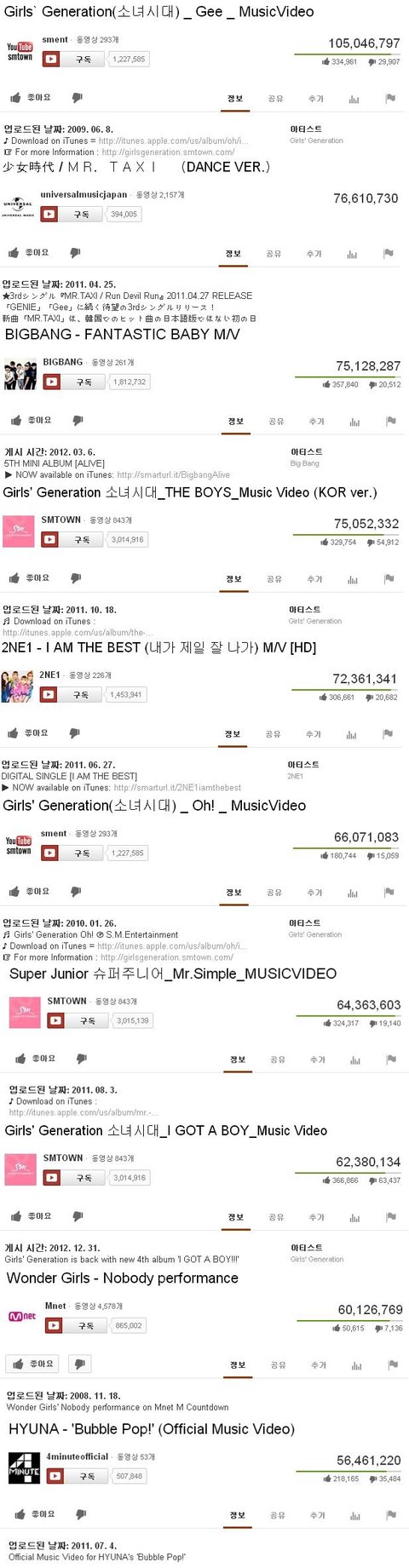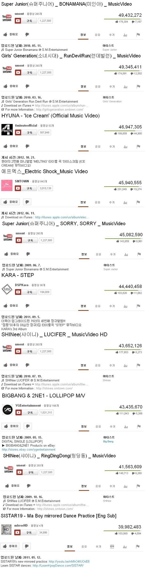 K-POP 아이돌 역대 유투브 조횟수 순위
