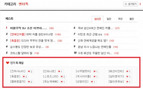 해당 카테고리에서 가장 인기가 있는 채널로, 즐겨찾기 수 및 톡 채널 하위 글 수를 집계하여 결정됩니다. 판 홈과 카테고리 목록화면, 톡톡쓰기 화면 등에서 확인하실 수 있습니다.