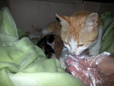 밖으로 옮겨서 놓아둔 새끼를 다시 출산박스로 옮겨갈만큼