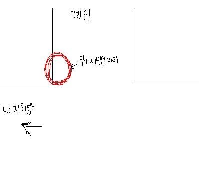 임가지는 그림에서 보는것처럼, 내 방쪽에선 잘 보이지 않는 곳이였슴. 모퉁이에 가까워져서 센서등이 켜졌을때 그 빛이 비쳐서 뒤늦게 서 있는걸 발견하고 식겁한거였슴.