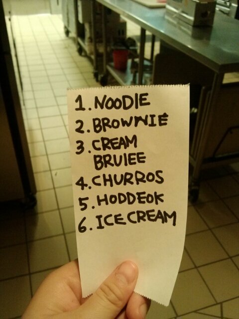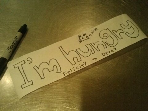 내가 일하다가 너무 배고파 죽을것같은거임ㅠㅠ데릭은 그릴파트인데 디저트파트는 그릴파트 바로옆임ㅠㅠㅠㅠㅠㅠㅠ냄새가 나를 죽일듯이 심하게 맛있음ㅠㅠㅠㅠㅠㅠㅠㅠㅠㅠㅠㅠ맛있는것좀 만들어 달라고 하려는데 데릭이 너무 바빠보여서 내가 편지를 썼음 "I'm hungry" 진짜 배고파서 쓰러지려고 할때 갑자기 데릭이 내눈앞으로 피자를내밀음!!!!!!!!!