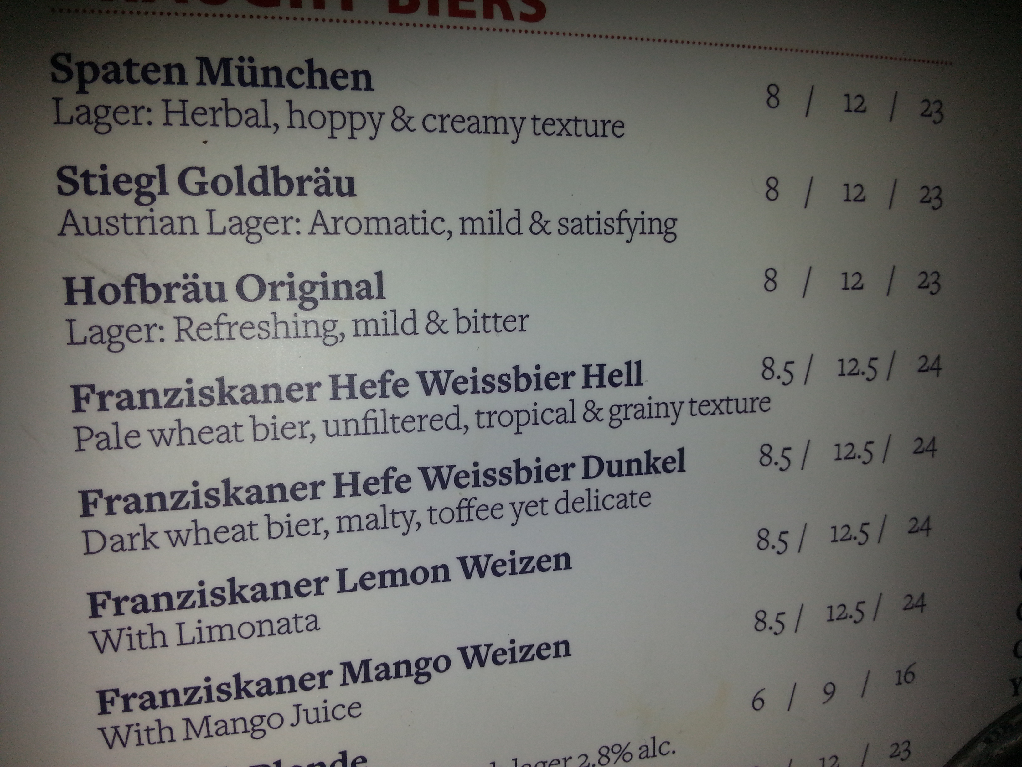 이 레스토랑의 인기있는 메뉴는 역시 독일맥주입니다. 이 레스토랑은 독일 현지에서 마실 수 있는 많은 종류의 맥주를 보유하고 있습니다. 대부분 맥주의 맛도 부드럽고 깔끔한 편이라 한국인의 입맛에 잘 맛을 것 같습니다. 저는 독일친구의 추천으로 Franziskaner Hefe Weissbier Hell 이라는 산뜻한 향이 나는 맥주을 마셔보았습니다. 이 친구가 뮌헨에서 왔는데 자기가 제일 좋아하는 맥주라고 꼭 먹어보라고 추천해서 한번 도전해 보았습니다. 맥주의 목넘김이 아주 부드럽고 마실 때 상큼한 향이 났습니다. 하지만 청량감은 조금 떨어 졌지만 매우 신선한 맥주였습니다. 그리고 이 레스토랑의 메인 요리도 아주 평이 좋습니다. 가장 유명한 메뉴는 Roast Pork인데 가격은 조금 비싸지만 맥주와 함께 먹으면 정말 맛이 좋습니다. 이 요리는 포크커틀릿, 햄, 몇몇 돼지고기로 구성되는데 아주 푸짐한 느낌을 줍니다. 소스 또한 음식과 잘어우러져 맛을 더합니다.