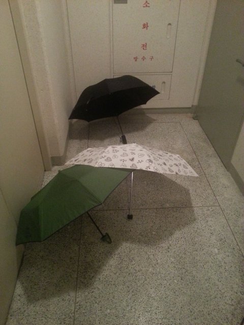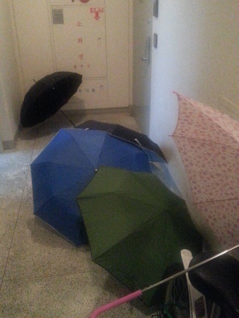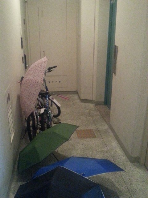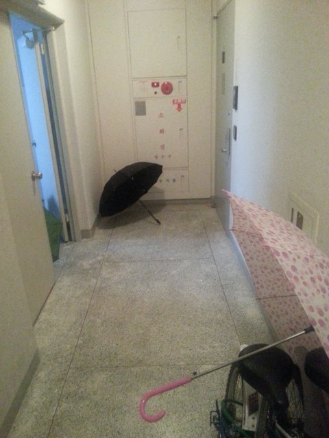 일단 엘레베이터를 내리고 제 우산을 저희집 현관문 앞에 살포기 펼처놓은후 사진을 찍었죠.