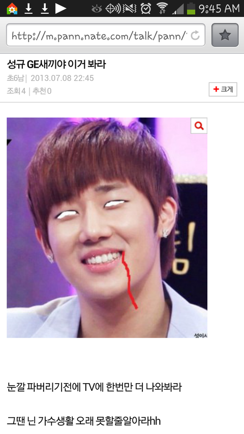 캡쳐했거든요? 사람 진짜 그렇게 살지마요. Tv에 다시 나오면 눈깔을 파버리겠다니요.. 싫으면 그냥 가만히 있어요, 이딴 사진 올려서 욕하지말고.. 진짜 심하다.