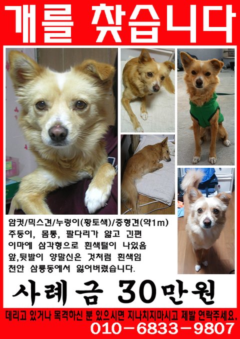 보호하고 계시거나 목격하신 분이 있으시면 연락부탁드립니다.