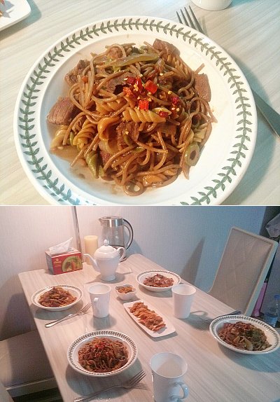 냉장고에 있는 재료로 급히 만든 오리엔탈 소고기 파스타.