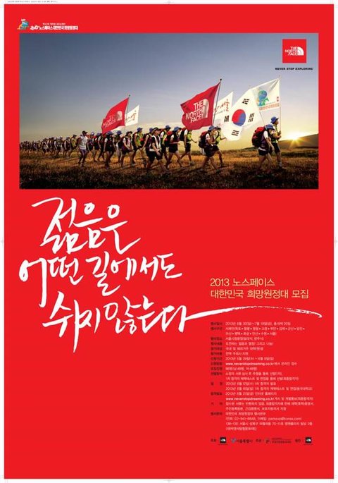 우리나라 대표적인 국토대장정 단체로는 노스페이스 희망원정대, 박카스 대학생 국토대장정,