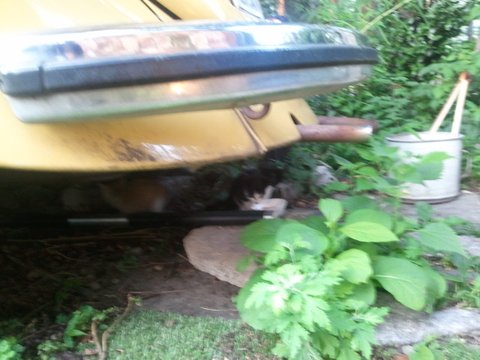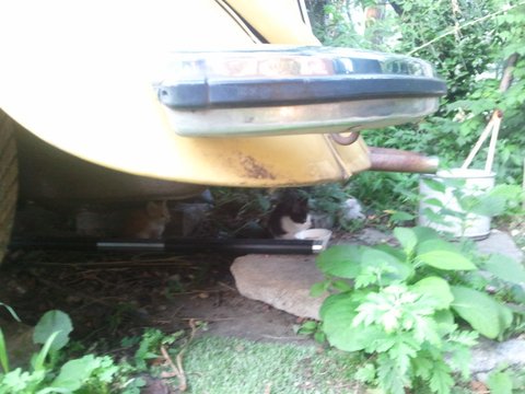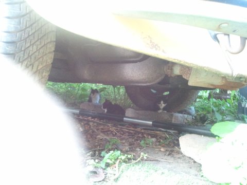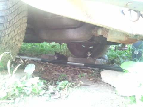 왼쪽 고양이는 '어서와~ 차 밑은 처음이지?' 하는 표정임