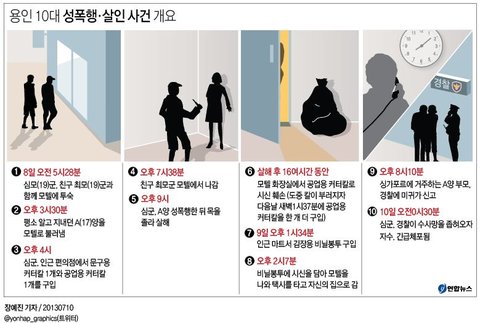 "이 과정에서 심 군은 9일 오전 1~2시께 모텔에 함께 투숙했다가 범행 전 혼자 모텔방을 나간 친구 최모 군(19)에게 ‘작업 중이다’, ‘지금 피 뽑고 있다’ 등의 문자 메시지를 보낸 것으로 드러났다. 또한 모텔 화장실 안에서 훼손된 시신을 찍어 두 차례에 걸쳐 최 군에게 보낸 것으로 확인됐다. "