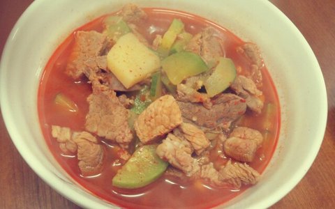 애호박 감자 은행썰기로 썰고 돼지고기 두툼하게 썰은거 양념해서 푹 끓여서 먹으면