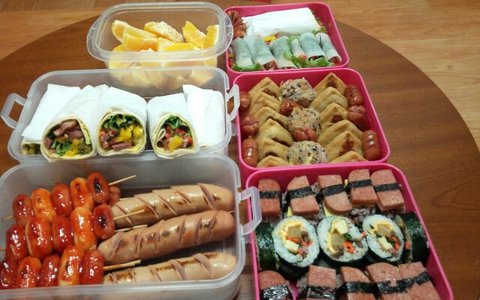 오렌지,훈제오리또띠아롤, 소시지떡꼬치, 소세지구이,스팸주먹밥, 치즈김밥, 유부초밥,주먹밥,