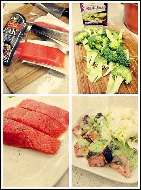 시중에 파는 브로콜리 치즈 스프를 이용해서 연어구이 샐러드 만든거에요~