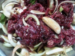 정육점가서 육회용 고기를 사면서 사장님보고 다져 달려고 했어요 여러 재료들을 넣고 회원분들이 단 맛을 좋아해서 집에 있는 꿀을 넣고 간장에 참기름에 굴소스를 약간 첨가하여 10분만에 만든 ㅎ육회