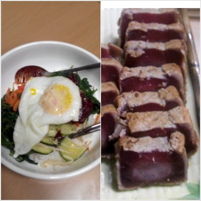 색다른 요리를 먹여보겠다는 일념으로 시장보러 갔다가 냉동참치를 발견했어요 바로 구입해서 실온이 한시간 정도 녹인 후 겉부분만 살짝 익혀서 먹였답니다. 비빔밥은 고추장 맛 때문에 맛있거 먹었고 참치는 제가 좋아하는 요리라서... ㄷㄷㄷ ^^;