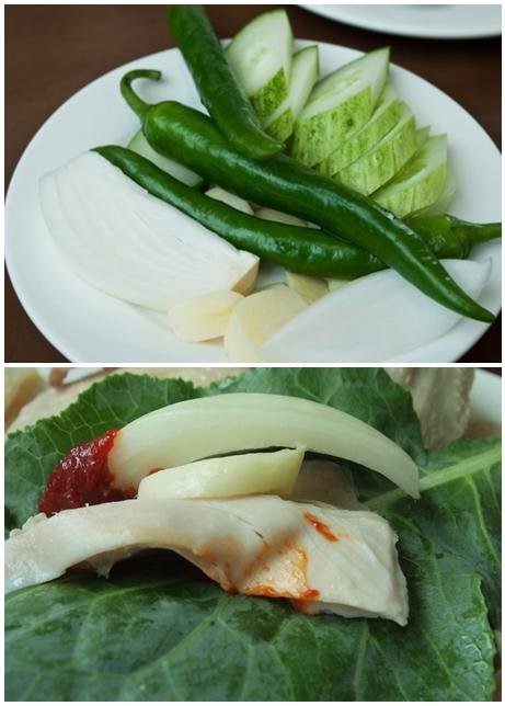 쌈에 양파와 마늘, 고추를 얹어서 한 입에 쏘옥~