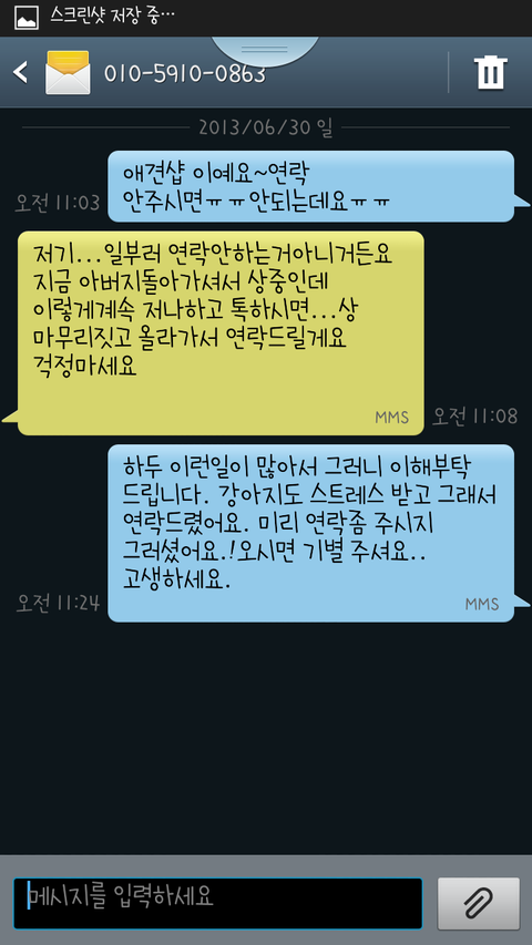 근데...아버지가 돌아갔는데 자꾸 연락하시면 곤란하다고.... 그래서 괜찮을때 연락 달라 했지만... 연락이없어 2 달이다되가 전화를 했지만 남편분이 받으시면서 이핸드폰이 아내가 갔고있지만 남편 님 명의 라고 자꾸 전화 하면 신고 할거라네요...그래서 강아지는 어떻하냐 했더니 버리라네요...그래서 경찰에 신고는 했지만......강아지는 크게 걸고 넘어 지지못한다고... 강력한 처벌을 원합니다..그래서 경찰 신고 안하는중이구요 호텔비 필요없습니다 좋은데 분양 보내고 싶어도 주인분이 포기각서 라도 쓰셔야 되는데.. 전화도 받으시질 않으시고 미치겠네요 강아지는 무슨죄일까요,.... 문자라도 하나씩 넣어주세요..포기 각서라도 쓰시러 오시라고........부탁입니다 저사진속 여자분이 이걸 보셨으면좋겠네여
