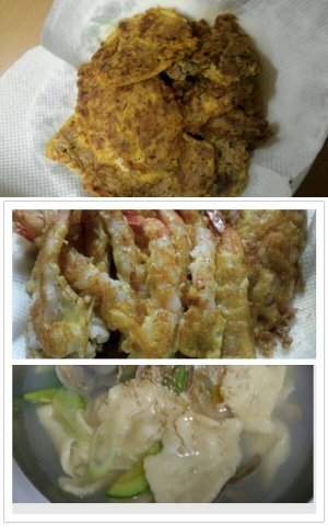 우리 어릴때 많이 해먹은 참치전 이거 할 때 기름기를 쫘악~ 빼는게 중요해요 안그러면 넘 느끼해요! 새우튀김은 쉬우니깐 패스!