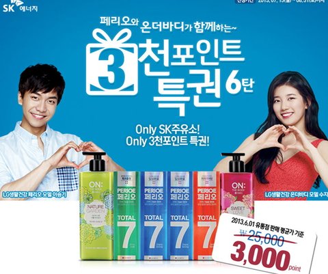 페리오 치약으로 양치하면 이승기처럼 빛이 나나요~ 온더바디로 샤워하면 수지처럼 향기나나요~(막던지는...)