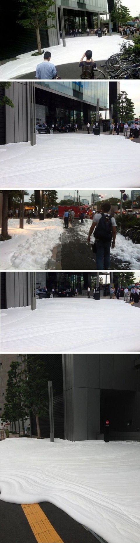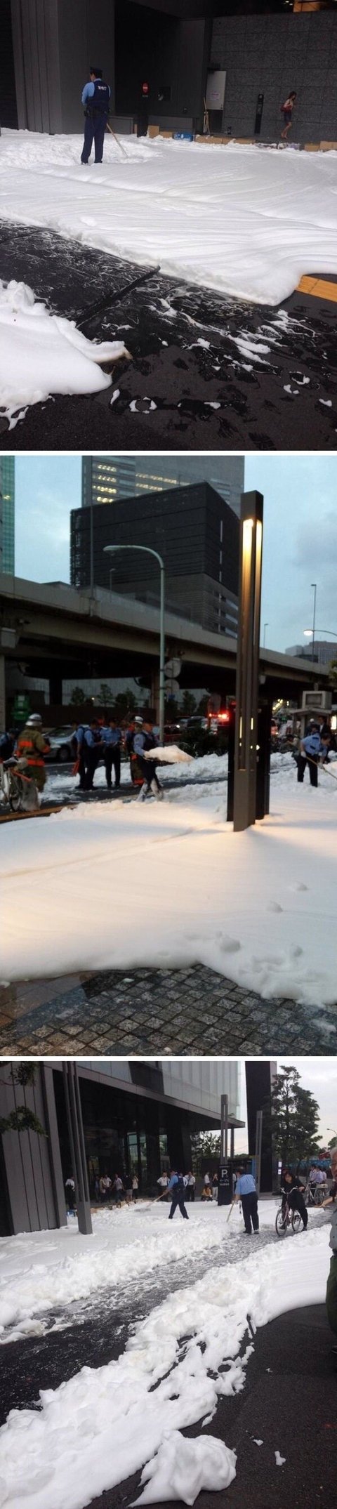 열도는 길거리 청소위해 거품을 뿌리면서 청소합니다.
