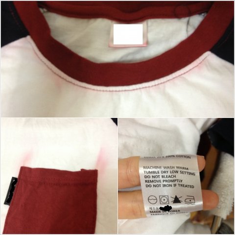 첫 번째로 옷의 염색 상태가 판매 기준 미달이어서 이염이 일어난 것이라고 합니다. 즉 제품불량인 것으로요. 두 번째로는 옷의 세탁라벨도 표기법대로 준수하지 않았다고 합니다. 한국에서 생산한 제품인데 영어로 된 라벨인 것, 100% 면 재질인데 세탁 법은 드라이클리닝이라고 그려져 있는데다가 그 그림조차 제대로 되지 않은 것이 첫 번째 문제였고요,