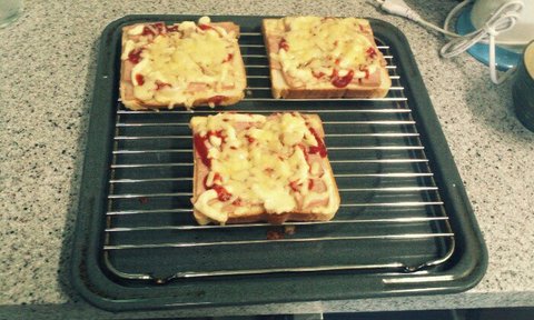 이건 중간고사 기간에 공부하다가 너무 배고파서 식빵에 케챱이랑 햄 양파랑 피망 올리고 치즈 뿌려서 만든 식빵피자에요.