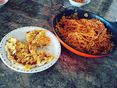 엄마랑 밤에 해투 야간매점 보고 너무 먹고 싶어서 다음 날 점심에 해먹은 나초오믈렛과 소세지스파게티!!