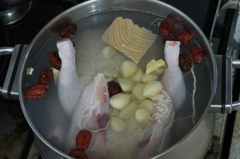 5.햔약재는 밑에 넣고 닭과 쌀 마늘 대추를 넣어 끓여 줍니다.