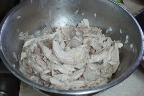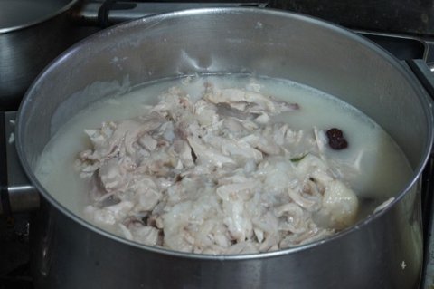 7.한약재료 건지고 닭살만 분리한 것 을 함께 넣고 끓여 줍니다.