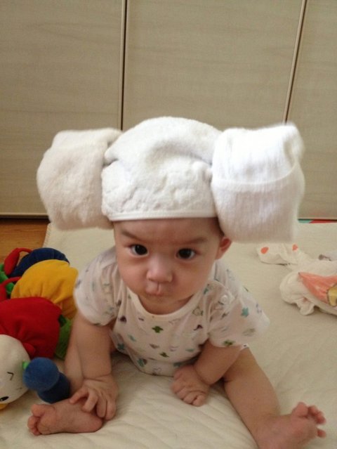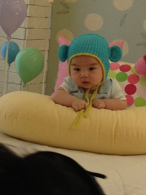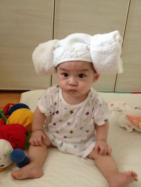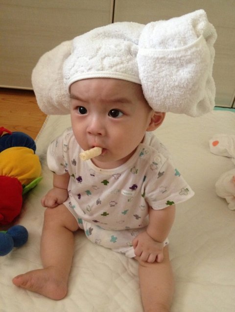 생후 200일경, 집에서 아빠가 양머리를 만들어줬길래, 씌여놓고 찍어보았습니다.