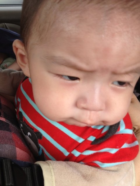 생후 180일경, 차를타고 가다, 뭐가 맘에 안들었는지 뾰루퉁한 표정을 짓네요.