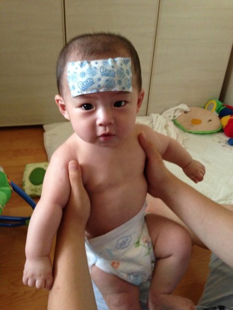 옷다벗기고, 물수건으로 닦아주다가, 해열패치도 붙여줬습니다.