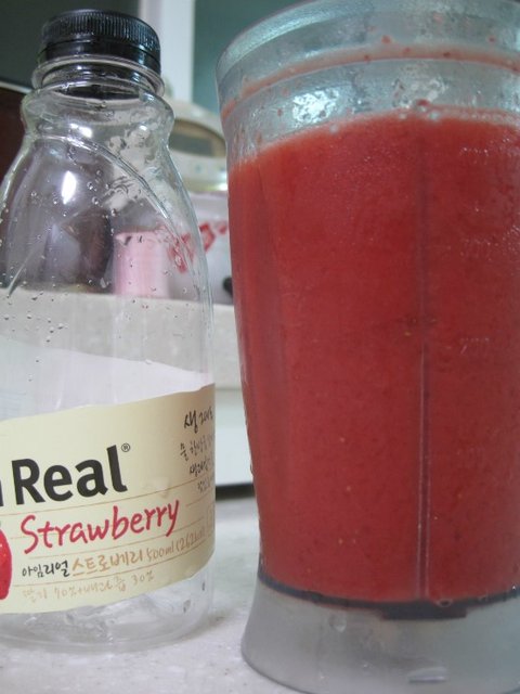 아임리얼이라고 아시죠? 생과일쥬스~ 냉동딸기+물조금+ 얼음 믹서기로 갈아서~ 여기 통에 담아