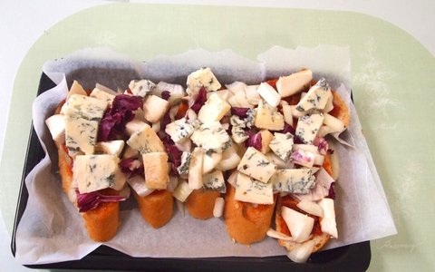 고르곤 치즈를 빵에 올려서 오븐에 간단하게 구웠어요