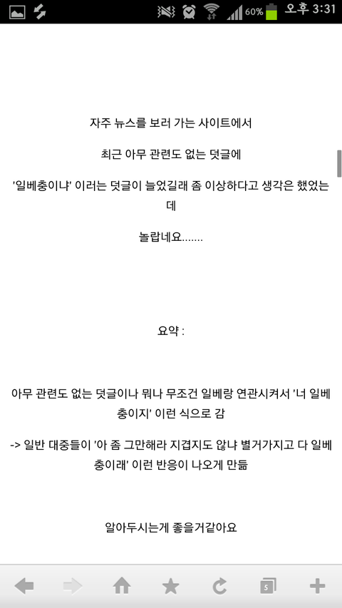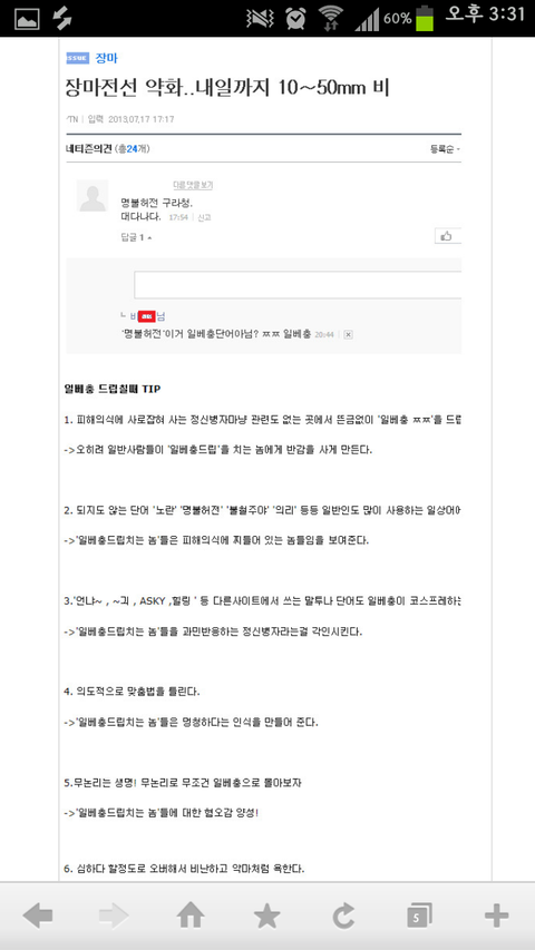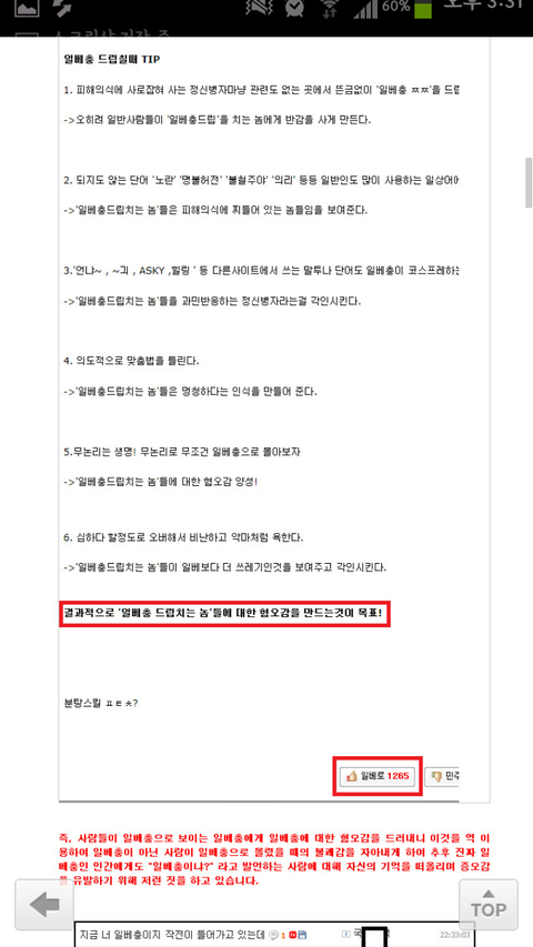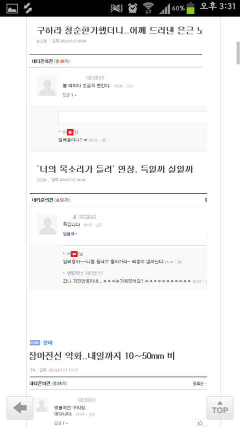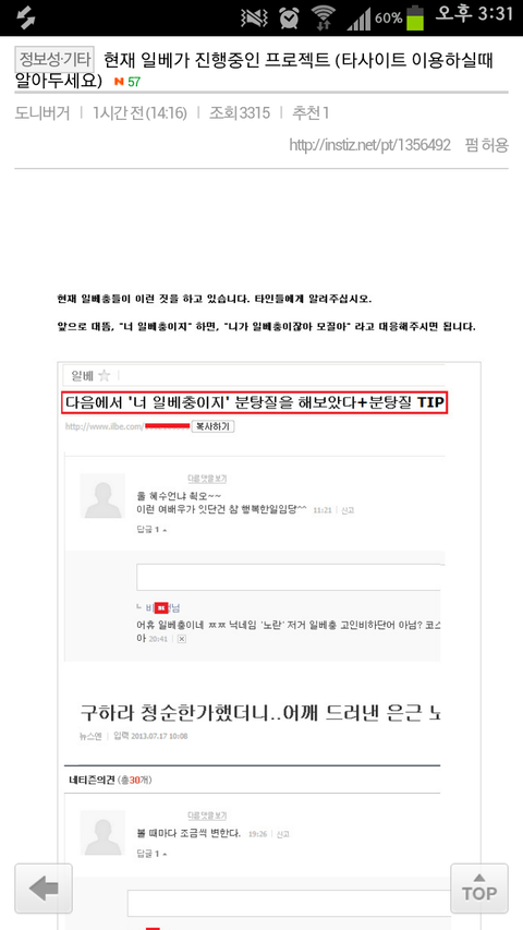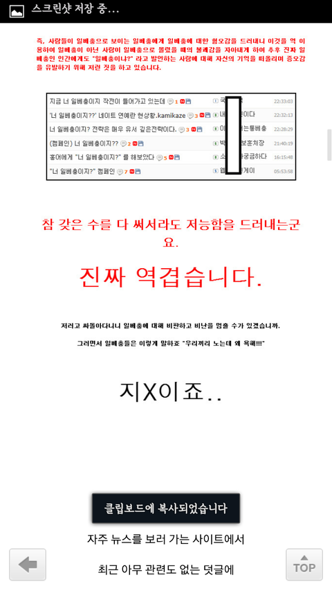 모바일에서 캡쳐한거라 pc로 보시는분들은 어떻게 보일지 모르겠네요.여튼 일베하시는분들 욕은안할테니 현실에서 자신이 일베하신다는거 밝혀주세요;;알아서 피해갈께요.주변사람한테 내가 일베한다는거 못밝히는이유가 당당하지못해서 아닌가요?(흑백논리 죄송ㅎ)개인적으론 오프라인상에서도 일베하시는분들은 일베하는사람들끼리 어울렸으면 좋겠네ㅋㅋ큐ㅜ