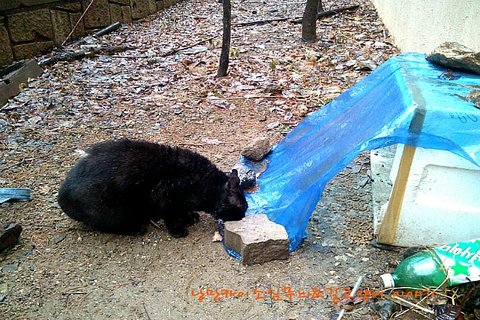 아파트 건물 밑 빈공간에 고양이들을 위한 밥과 물 그리고 추운겨울 조금이나마 따뜻하게