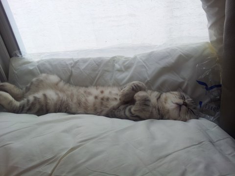 밖을 넘흐 동경해서 제방 큰 창을 개조(?)해서 만들어 놨더니 아주 좋아해요,요렇게 배드러내고 세상모르게 잔답니다.