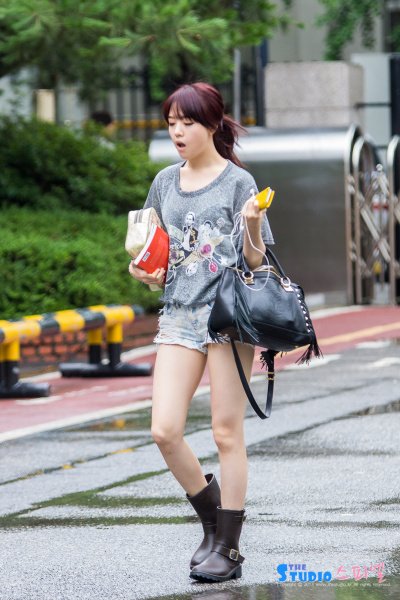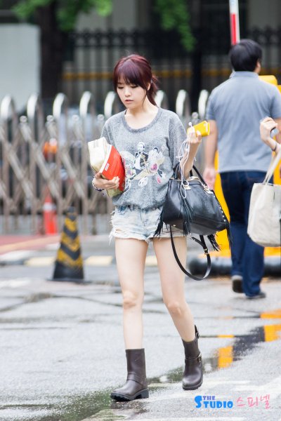 평범한 패션인 면티에 핫팬츠, 장화를 신었는데