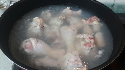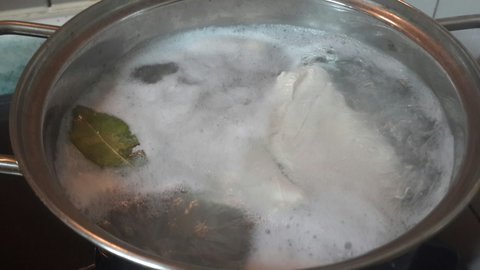 닭가슴살을 꺼내서 삶아주었어요 월계수 잎이 냉장고에 돌아다니길래 몇 장 띄워줬구요