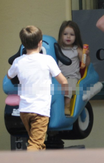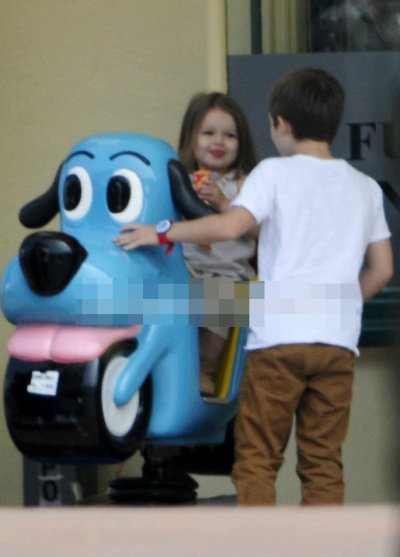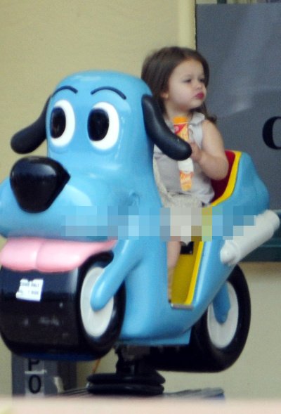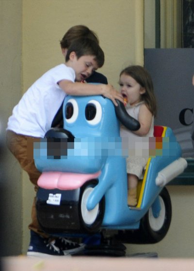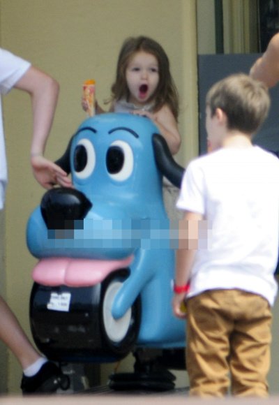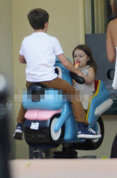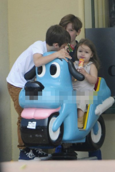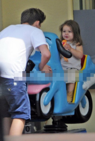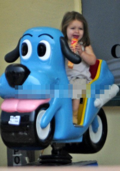 한 손엔 아이스크림을 들고 장난감 자동차에 올라탄 하퍼