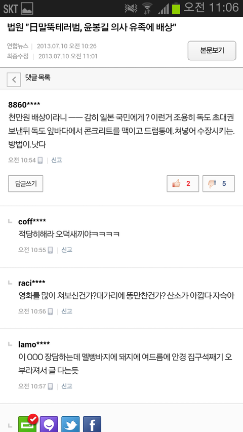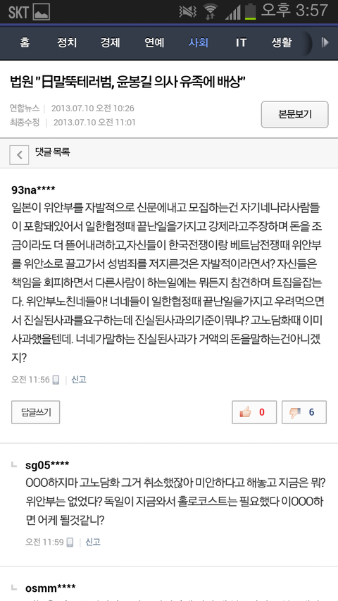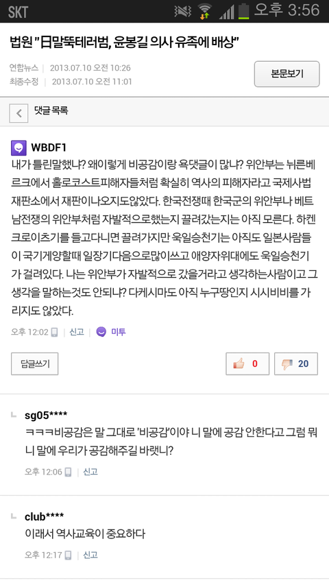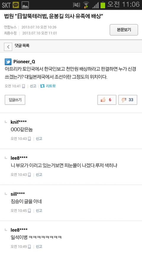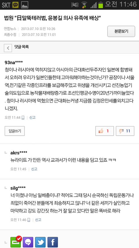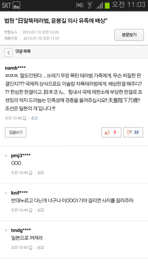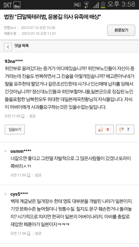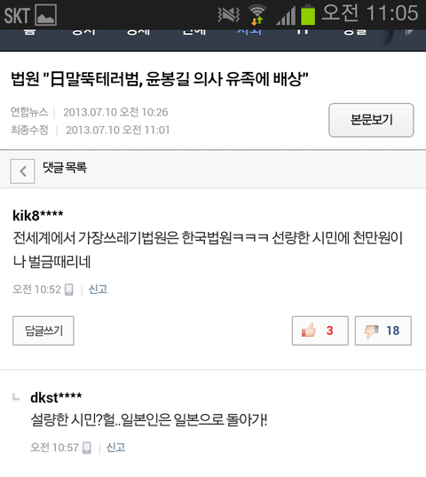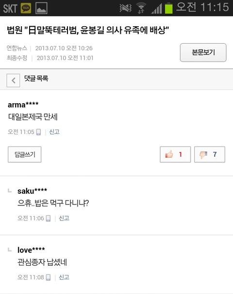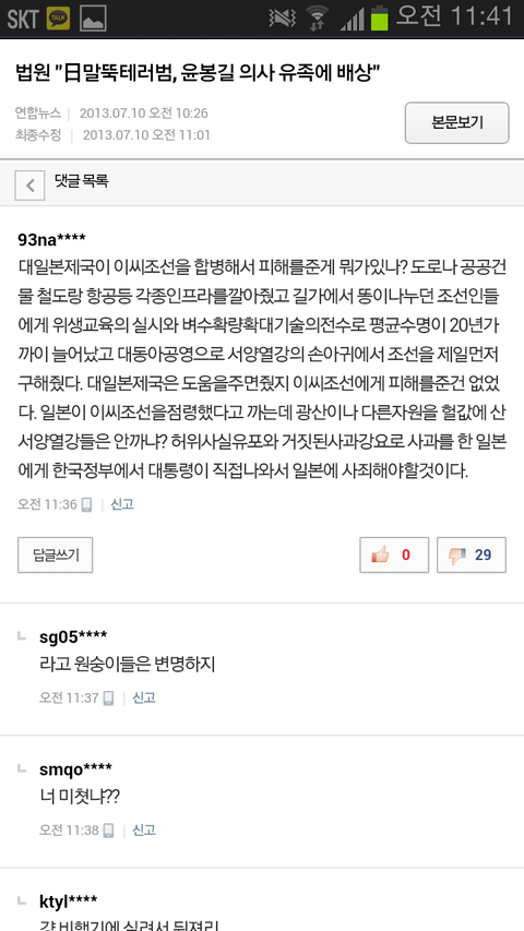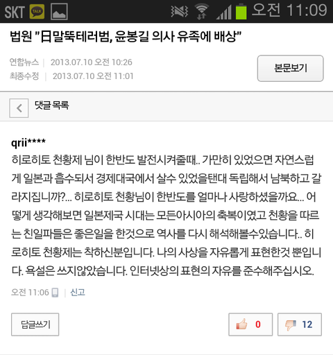제가 이런 친일적 댓글들이 보일 때 마다 신고른 했지만 욕설글이 아니라서 그런지 삭제가 안되더군요.