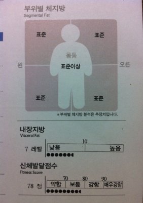 보시면 복부에 "표준이상"이라고 표시되어있고, 내장지방도 레벨10 만점 중에 7이죠.