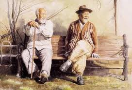 할아버지 2명이서 날씨 좋은날 공원 의자에 같이 앉아있는모습.