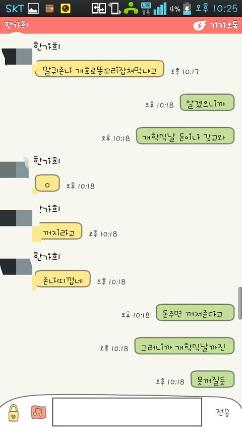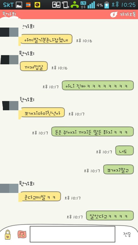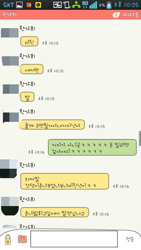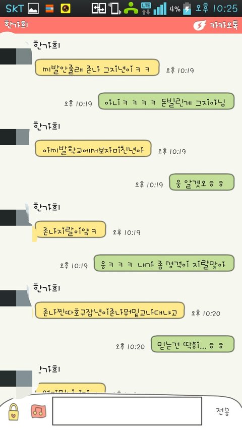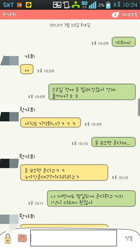 2주전쯤에 흔히 말하면 일진에게 돈을 빌려줫엇음 근데 그 일진이 지금까지도 돈을 안갚는거임 학교에서 돈을 달라 할때도 내일 준다며 계속 미뤗음 그리고 나중에는 엄마하고 싸웟다고 핑계를 대고 결국 방학식날에도 안줌 이러다가 못받을것같아서 카톡함 지금부터 톡내용 올리겠음