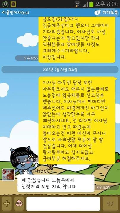 밀린지도 10일이 넘었네요 벌써;; 저 같은 알바생 급여뿐 아니라 종사하시는 모든 직원들 월급조차 주지 않고 있는 현실입니다. 저는 6월 28일부터 근무해서 2주에 한번씩 급여를 받기로 했었지만