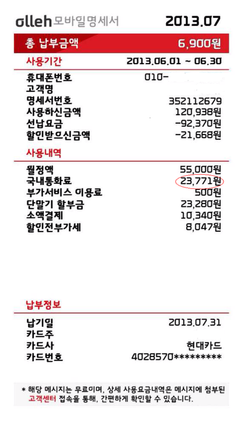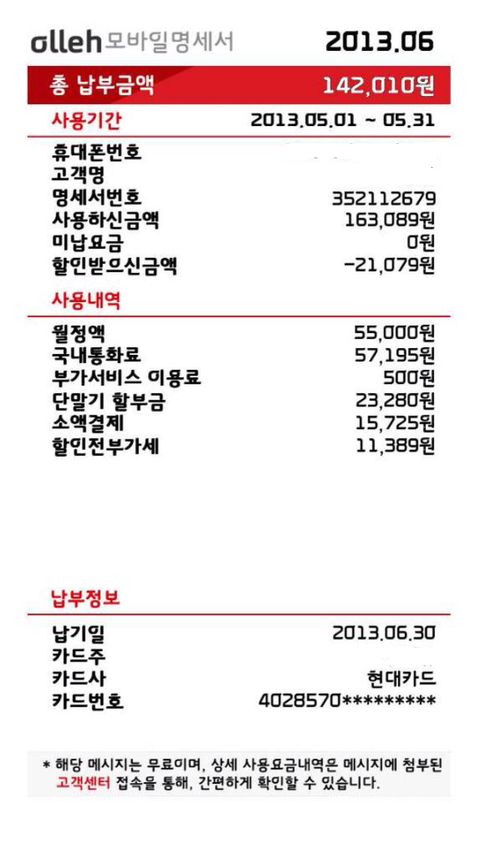위의 고지서는 KT에서 보내온 청구서 입니다