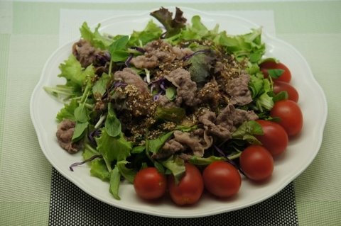 4.접시에 야채를 올리고 방울토마토를 옆에 놓고, 데친 한우 차돌박이를 올리고 소스를 뿌리면 한우 차돌박이 샐러드 완성입니다.
