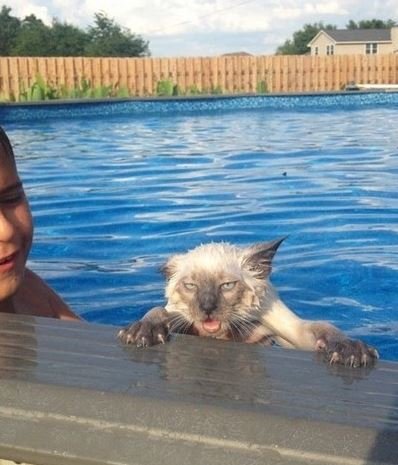 외국의 수영장에서 물에 빠진 고양이가 물 밖으로 빠져 나온 모습이 담겨 있는 사진인데