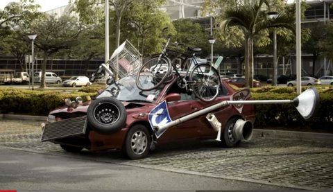차에 덕지덕지 붙어있는 자전거, 카트 등 물건이 대체 무슨 상황이 있었길래!~??